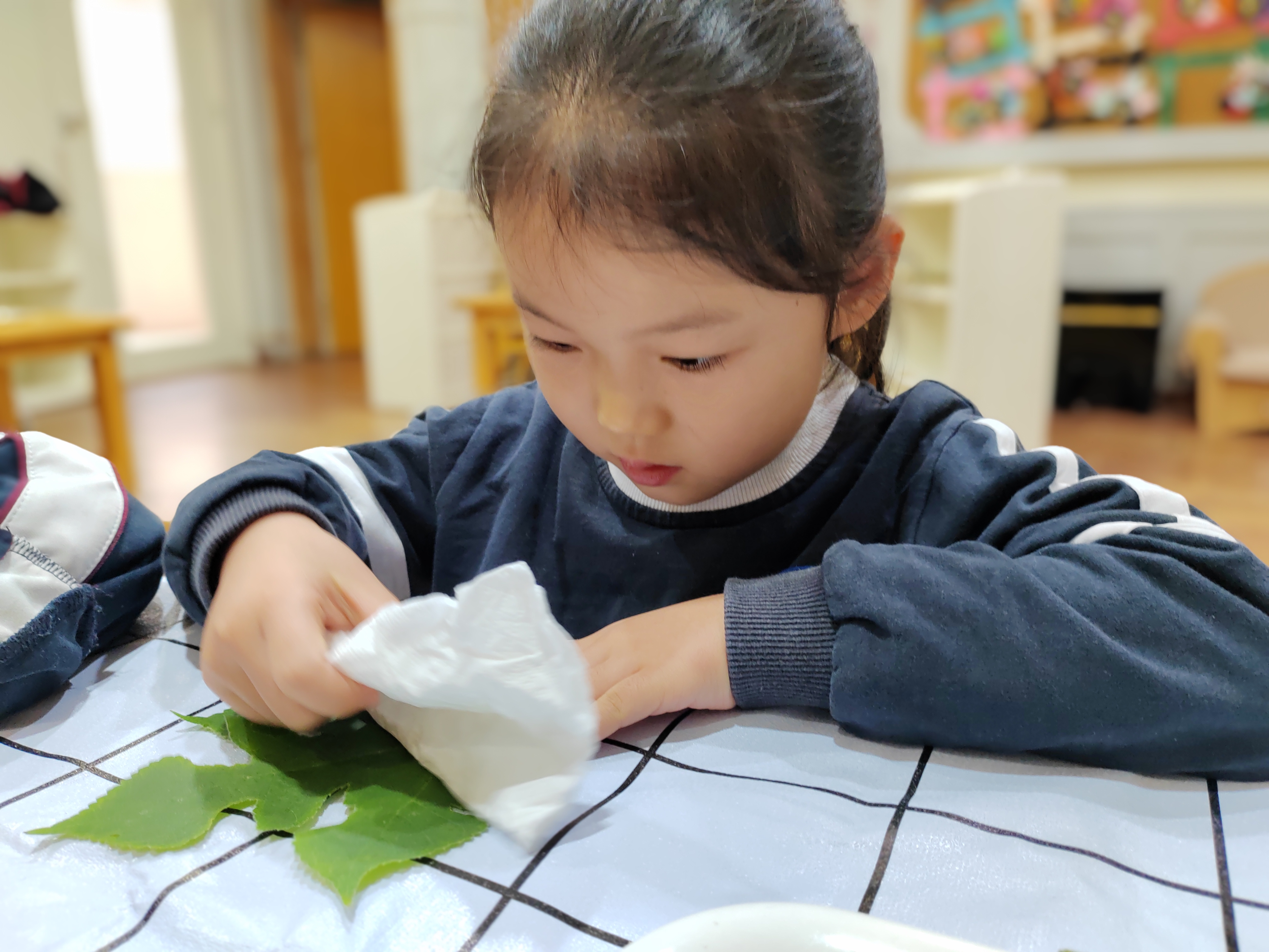 首先,小朋友们动手擦干净树叶的灰尘吧!