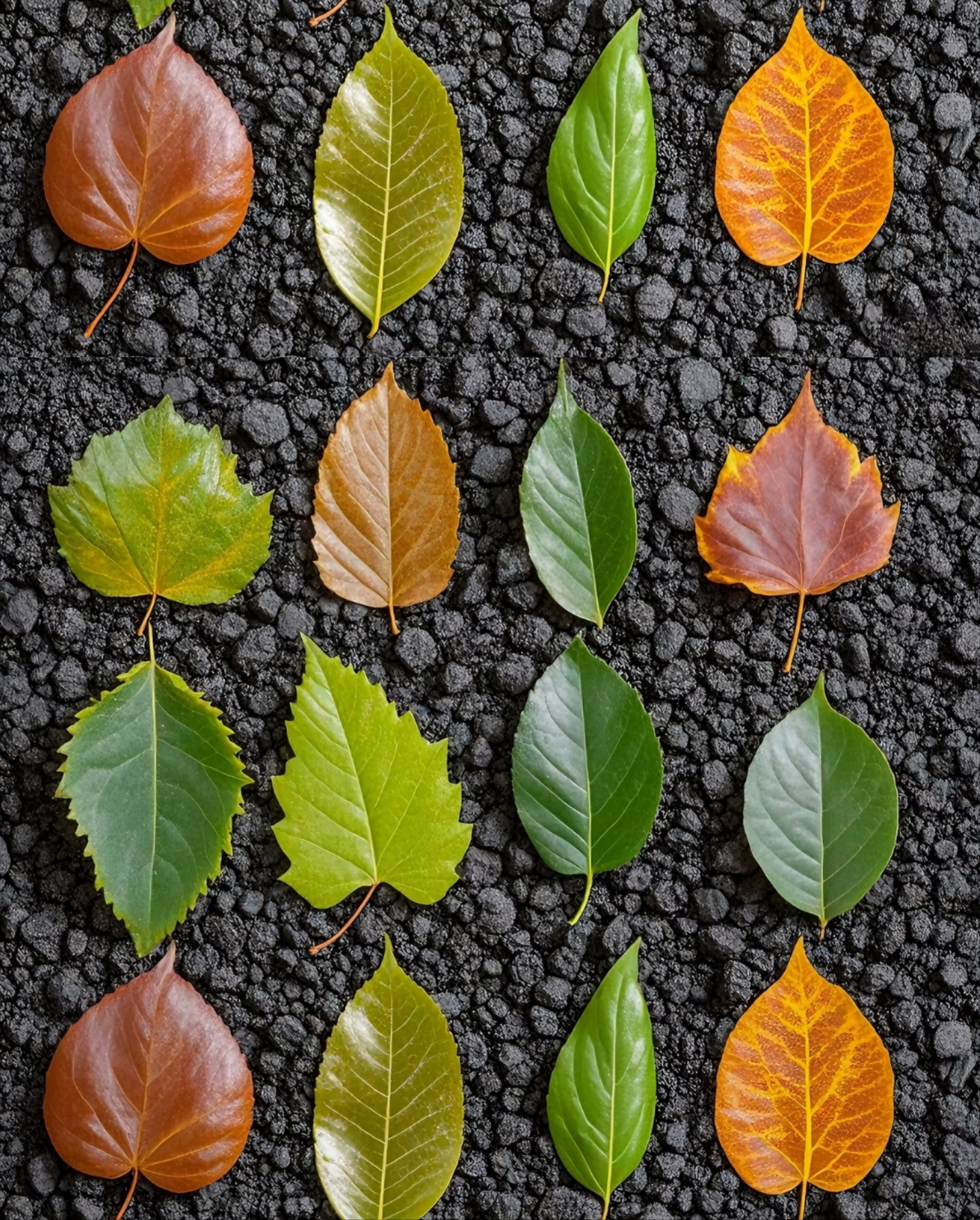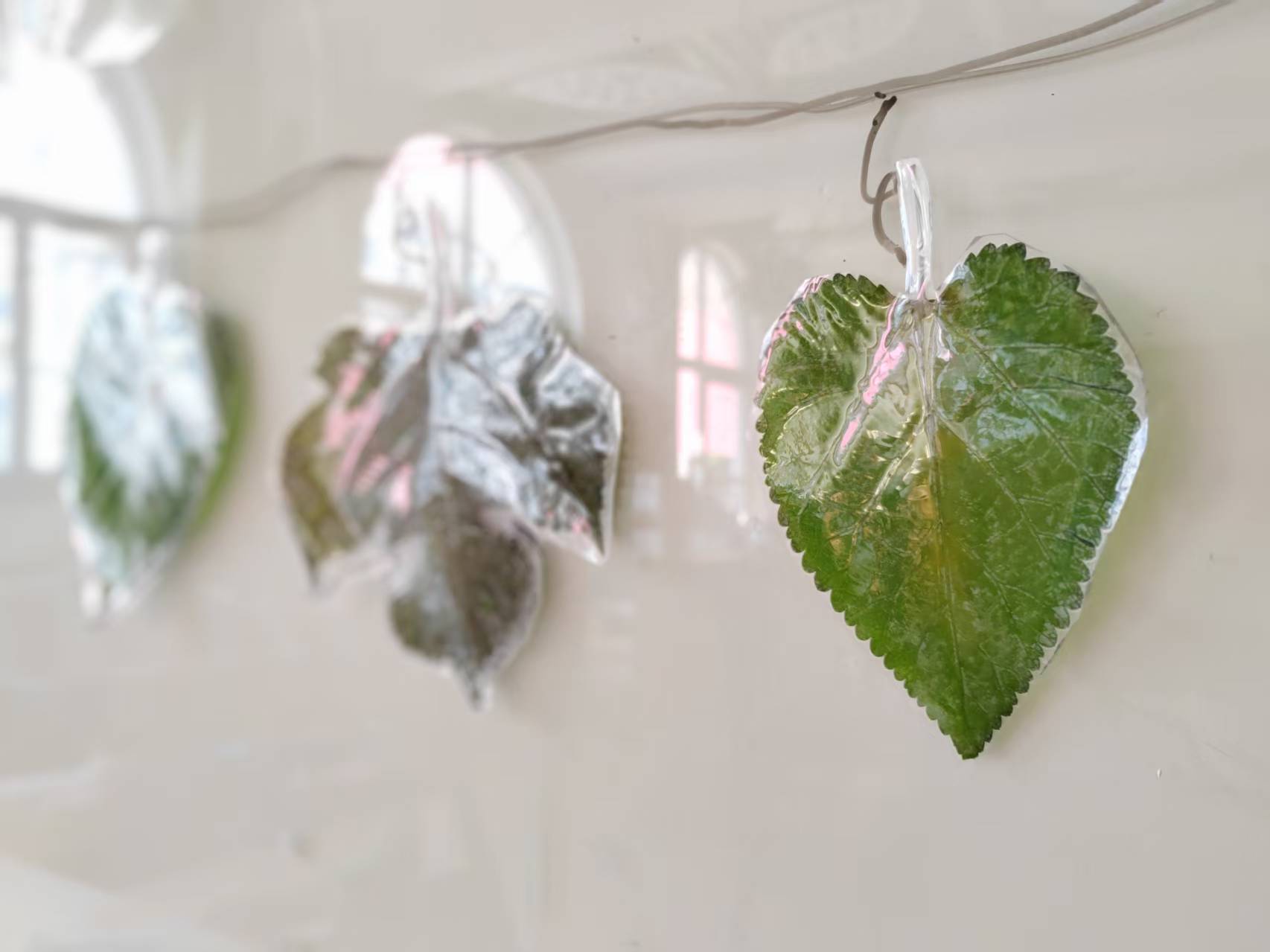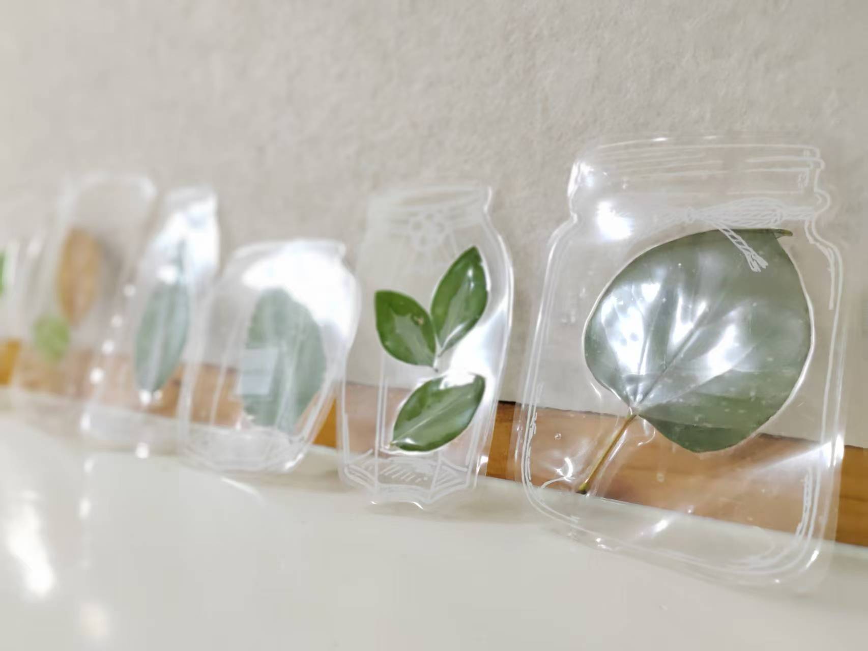 将擦干净的树叶摆放在塑封纸上,每两片叶子留有一定的间隙。