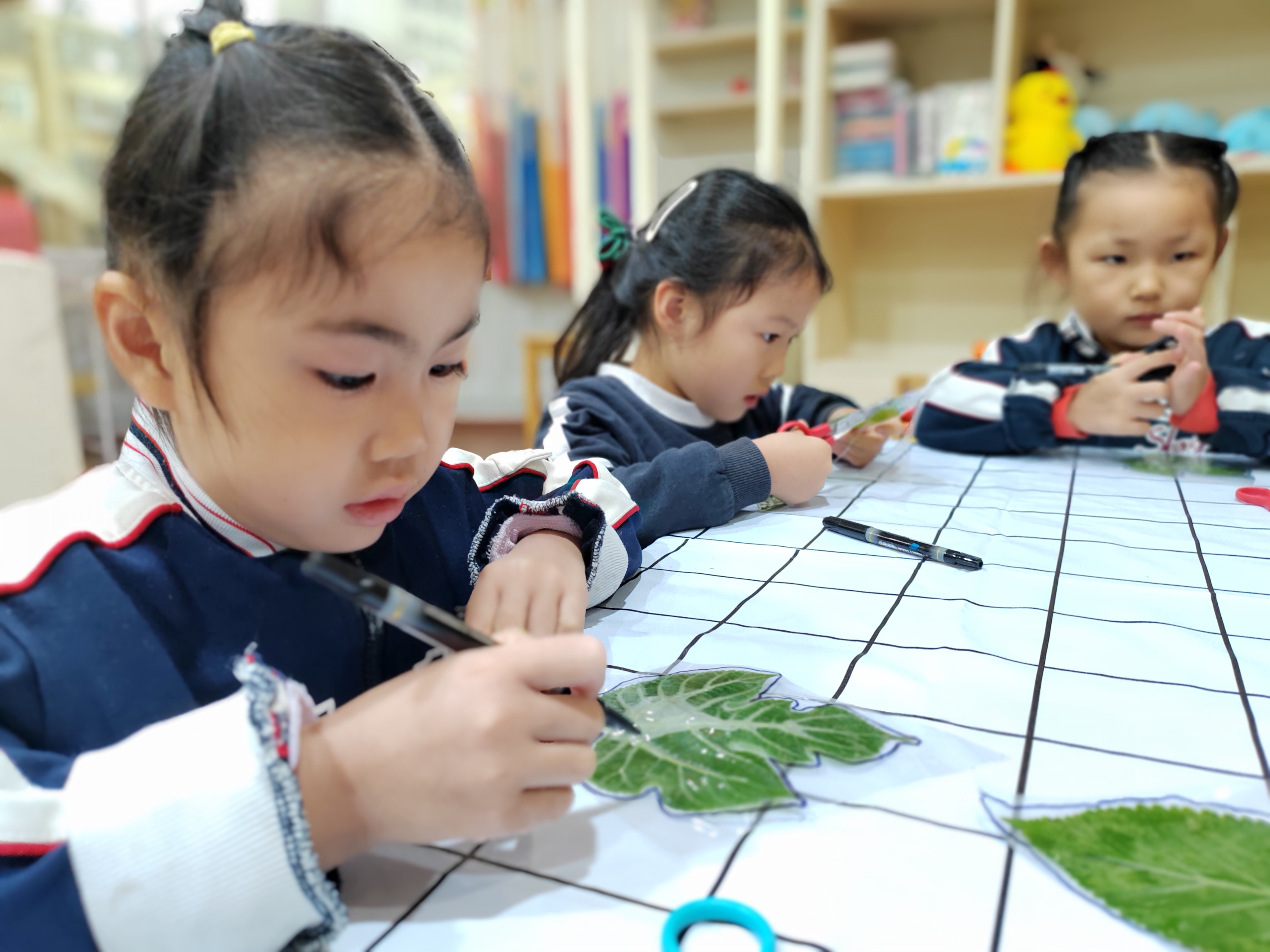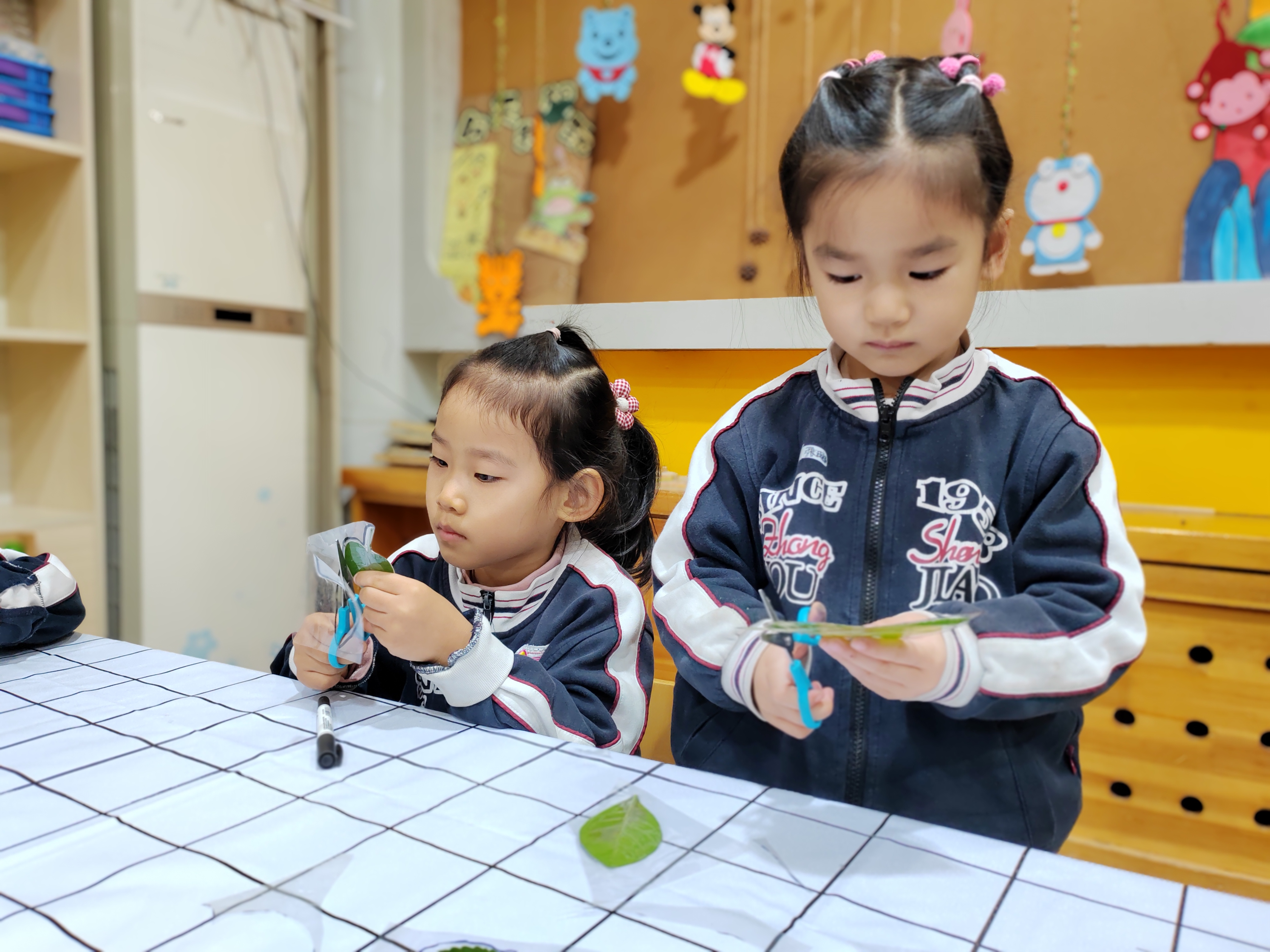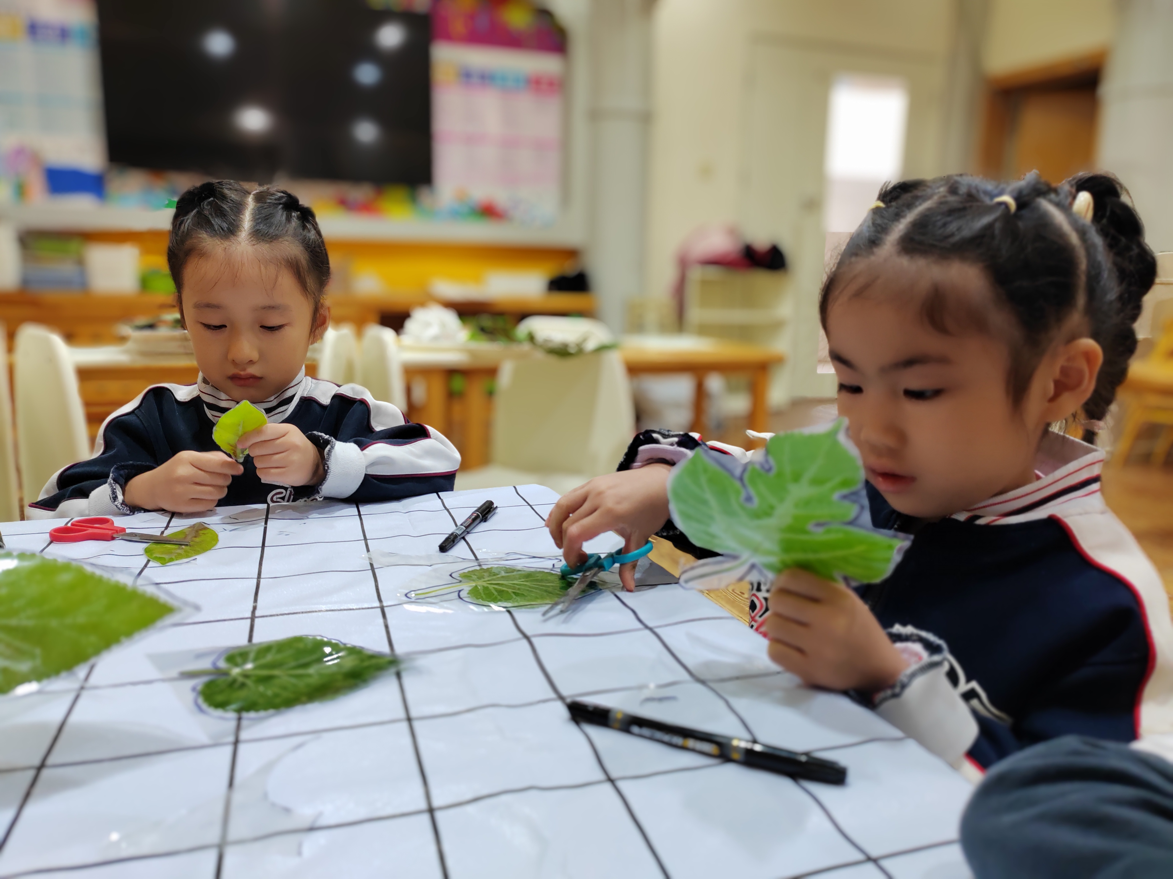塑封机温度有点高,在老师的帮助下叶子塑封好啦,哇,漂亮的叶子被密封在里面,接着小朋友用记号笔给树叶描边。