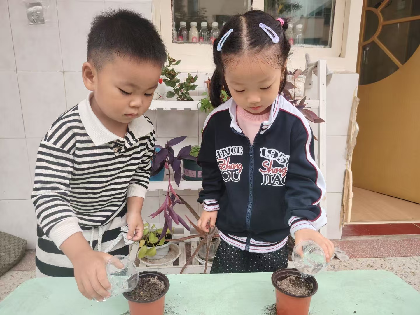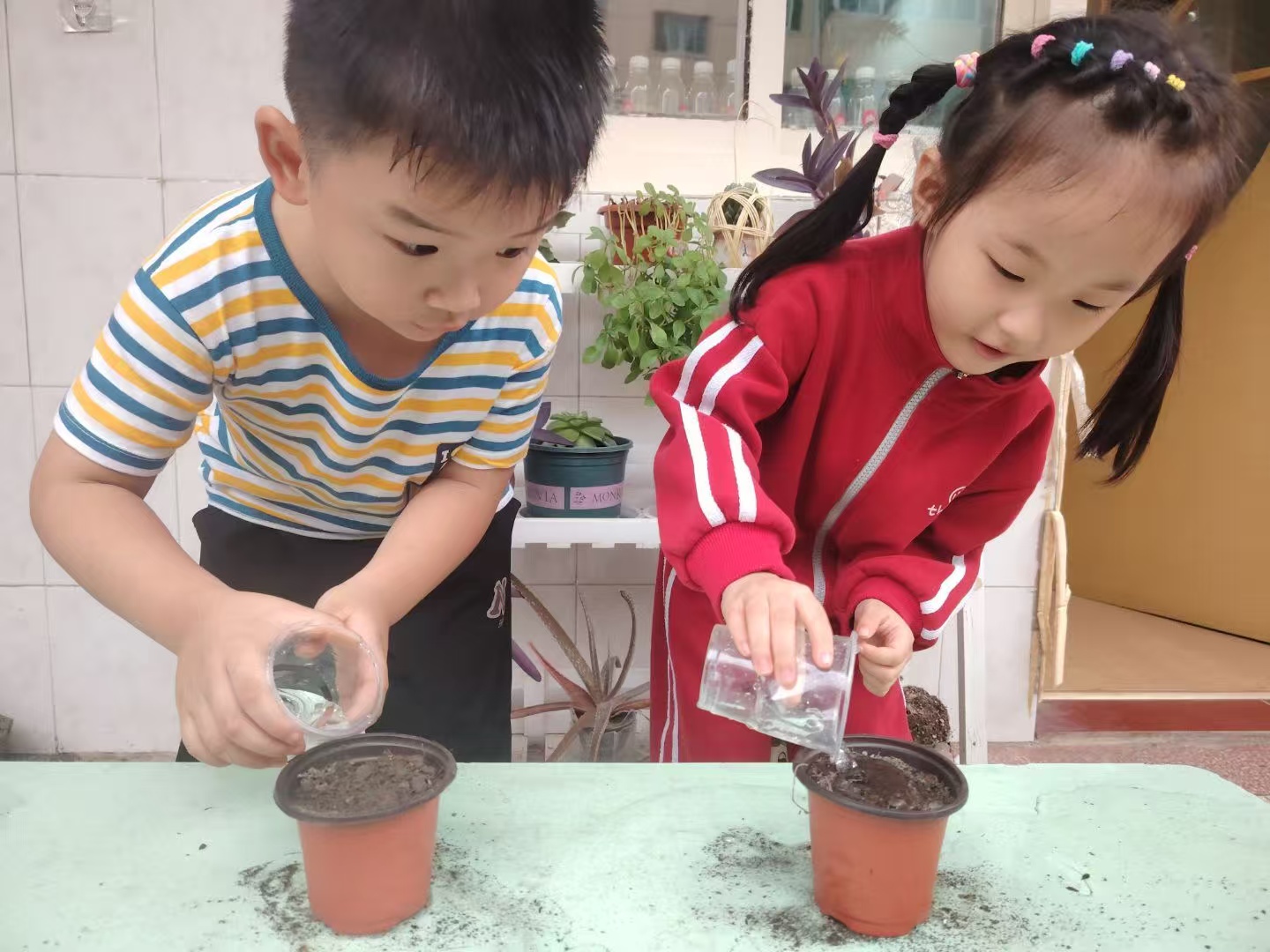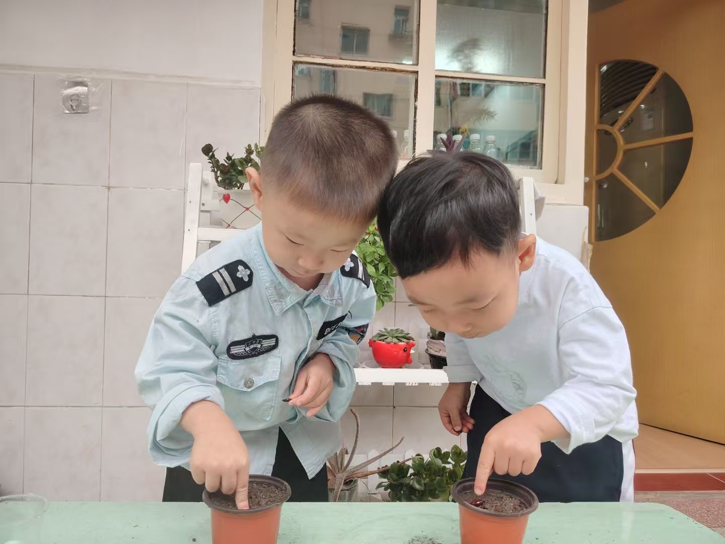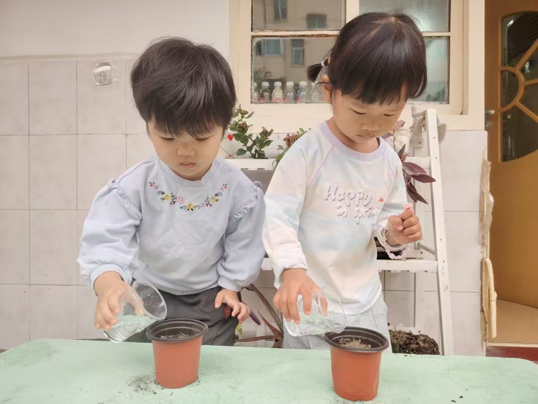 一个个小花盆被整齐摆放在班级自然角,成为孩子们每日牵挂的“小天地”。