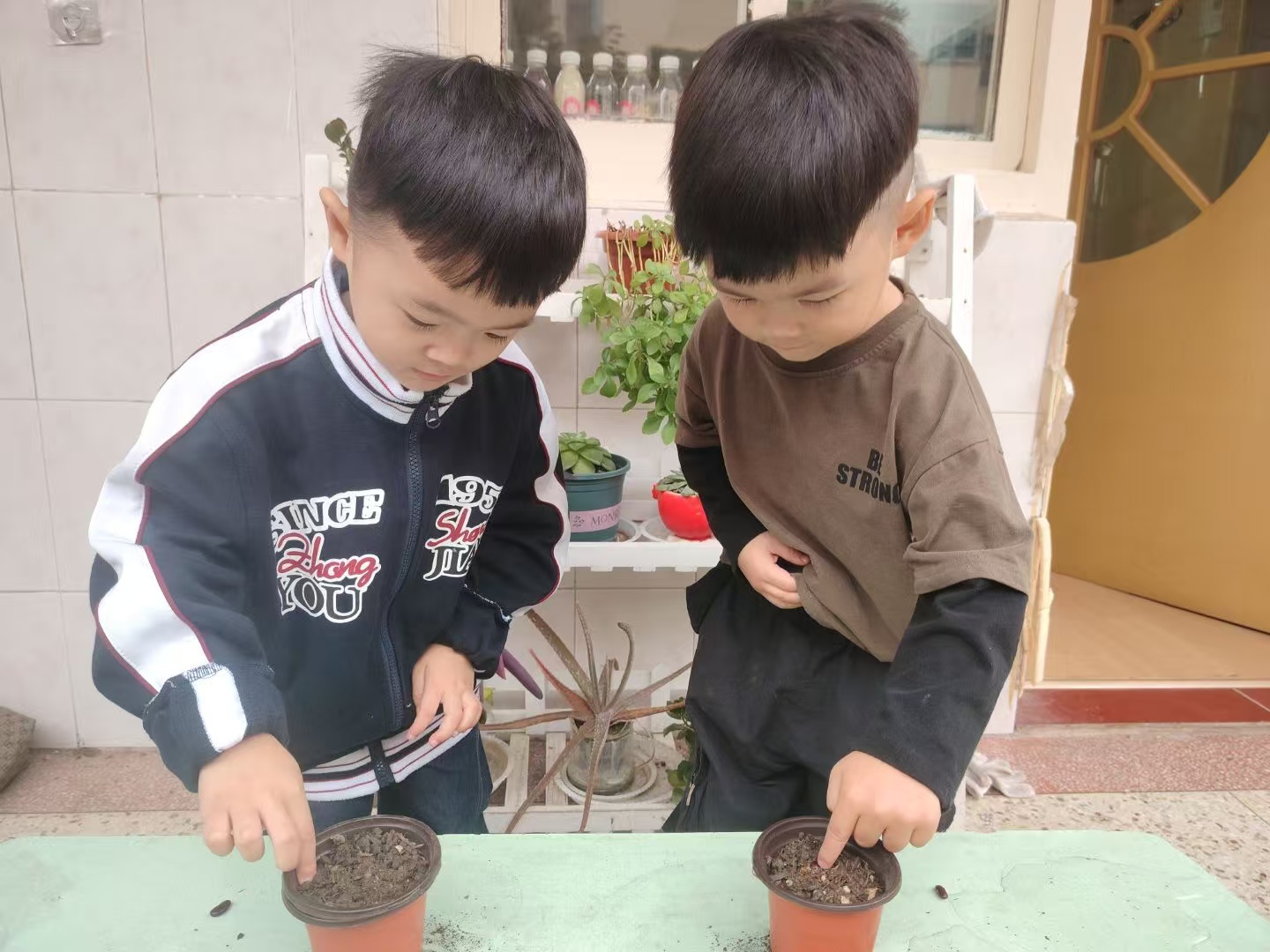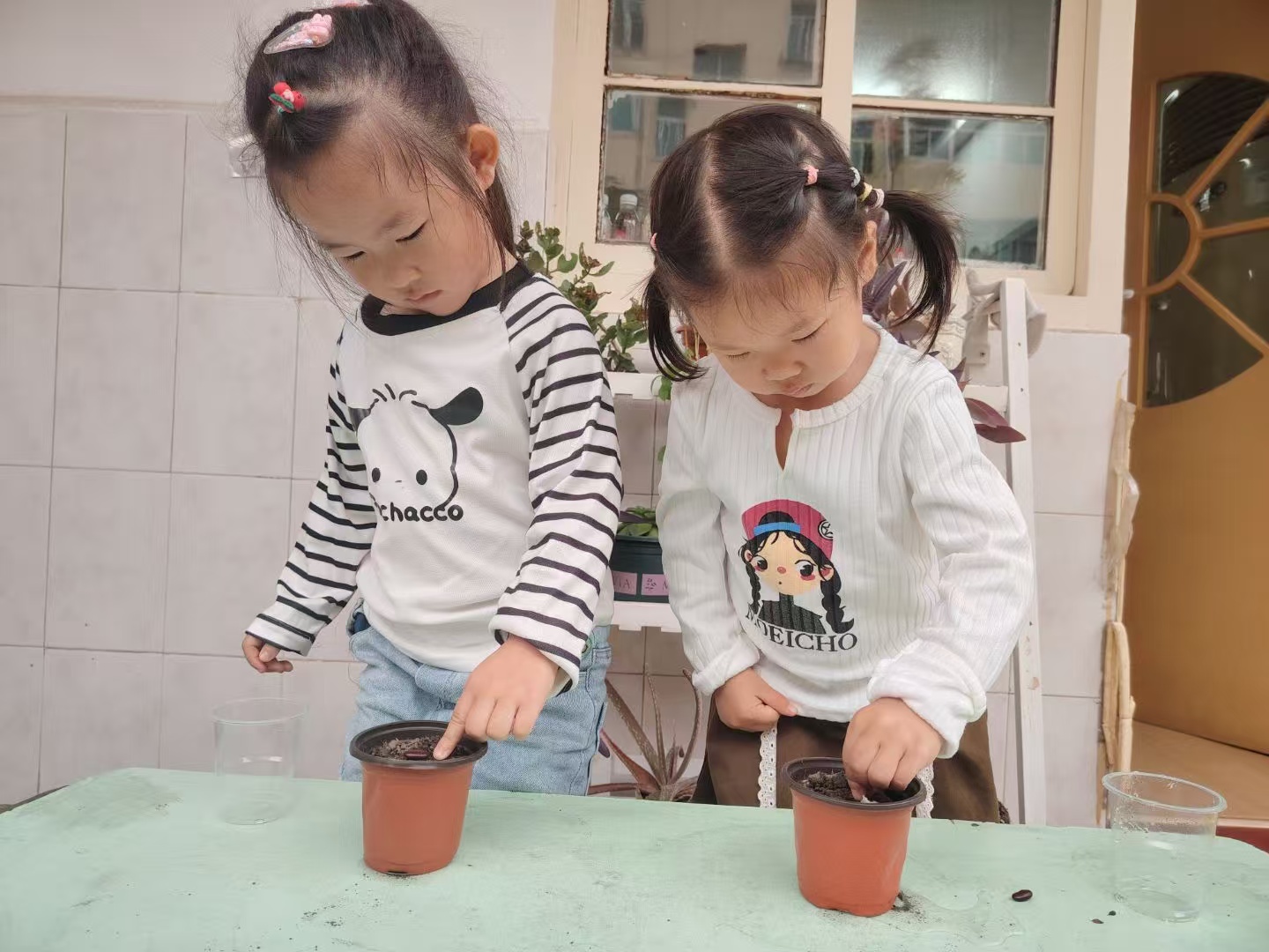 在老师的指导下,孩子们化身“小园丁”,有条不紊地开始播种。他们先将松软的营养土装入花盆,用小手指轻轻按出一个“小坑”,小心翼翼地放入芸豆种子,再盖上一层薄土,最后拿起小水杯,给种子浇上“唤醒水”。