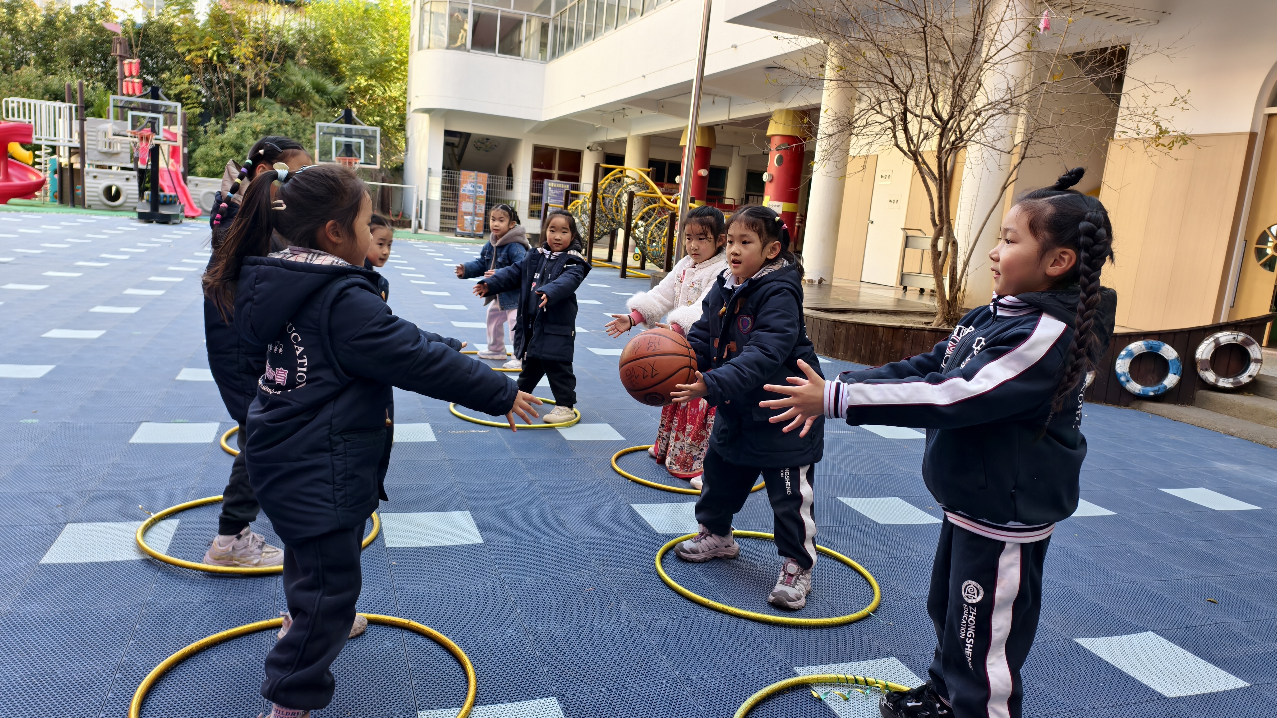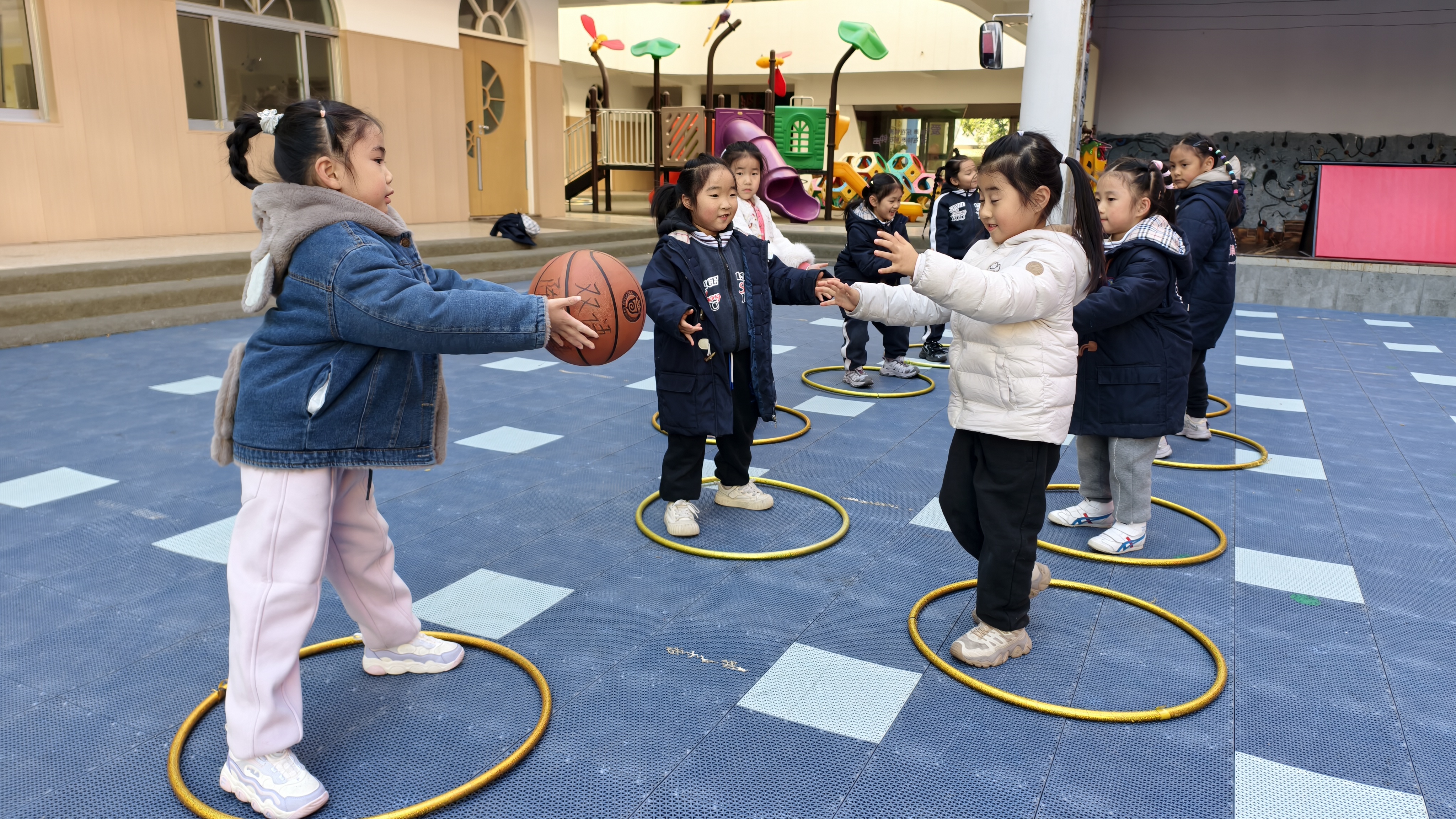 蓝色地垫上,一个个黄圈像撒开的小太阳,孩子们踮着脚站进去,小手张成“小翅膀”。穿藏青外套的女孩刚站稳,对面小伙伴递来的篮球就“咚”地落进她怀 里,惹得一圈人都笑出了小梨涡。