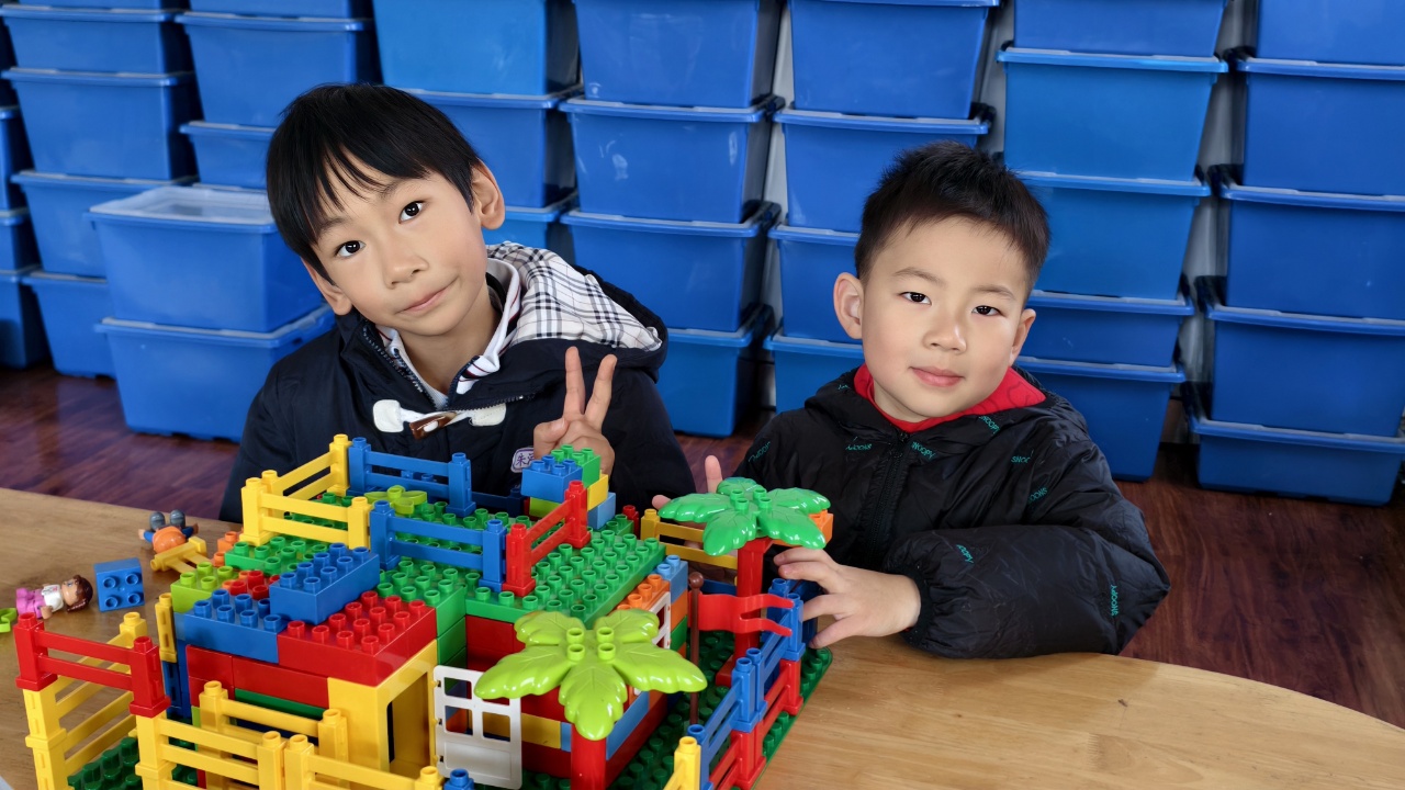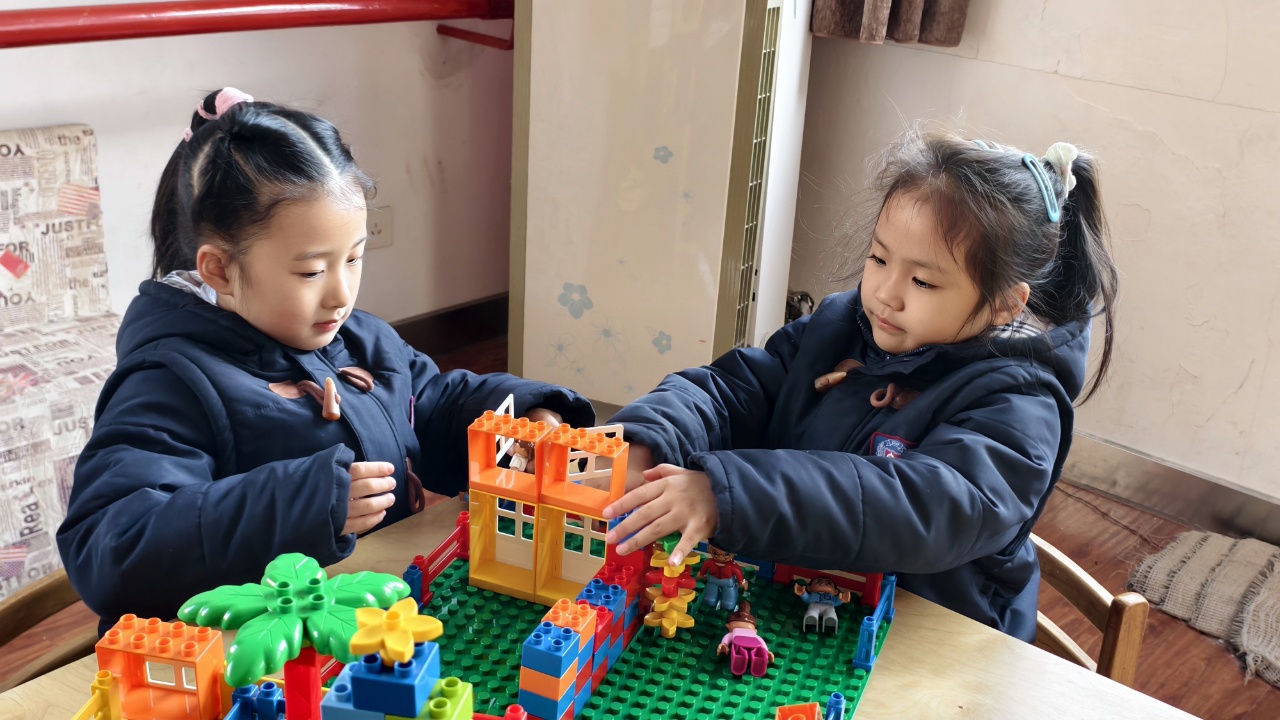 拼搭是独属于小朋友的“合作游戏”:穿同款藏青外套的两个女孩,对着橙色“房子主体”小声商量——“这里加个黄色窗户吧?”“不行,得留空给我的玩偶住!”最后她们在“屋顶”开了个“天窗”,既装了窗户,又给玩偶留了“观景台”。