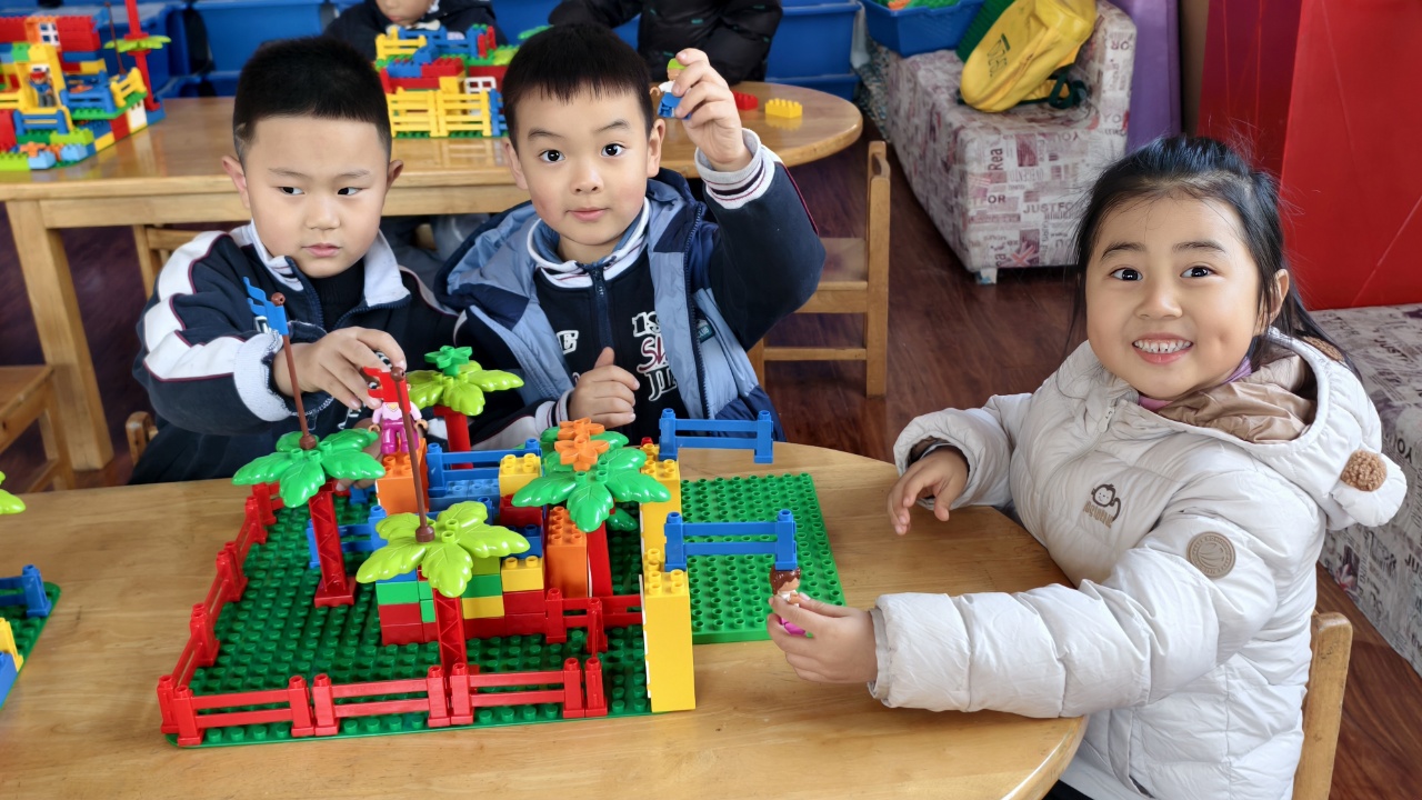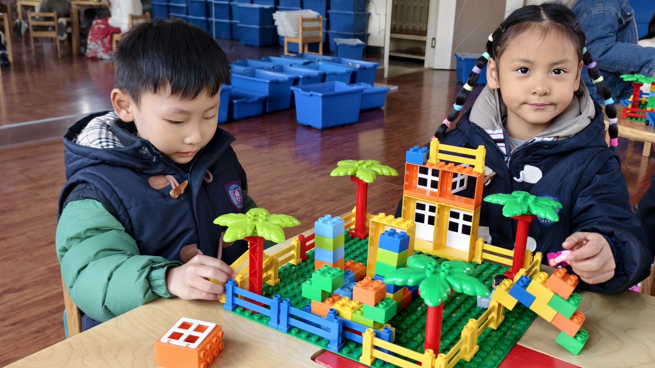 活动室的桌子上,彩色积木堆成了小丘:明黄的“墙”、湖蓝的“窗”、翠绿的“树”,还有粉色小人偶站在红色“烟囱”上“瞭望”。