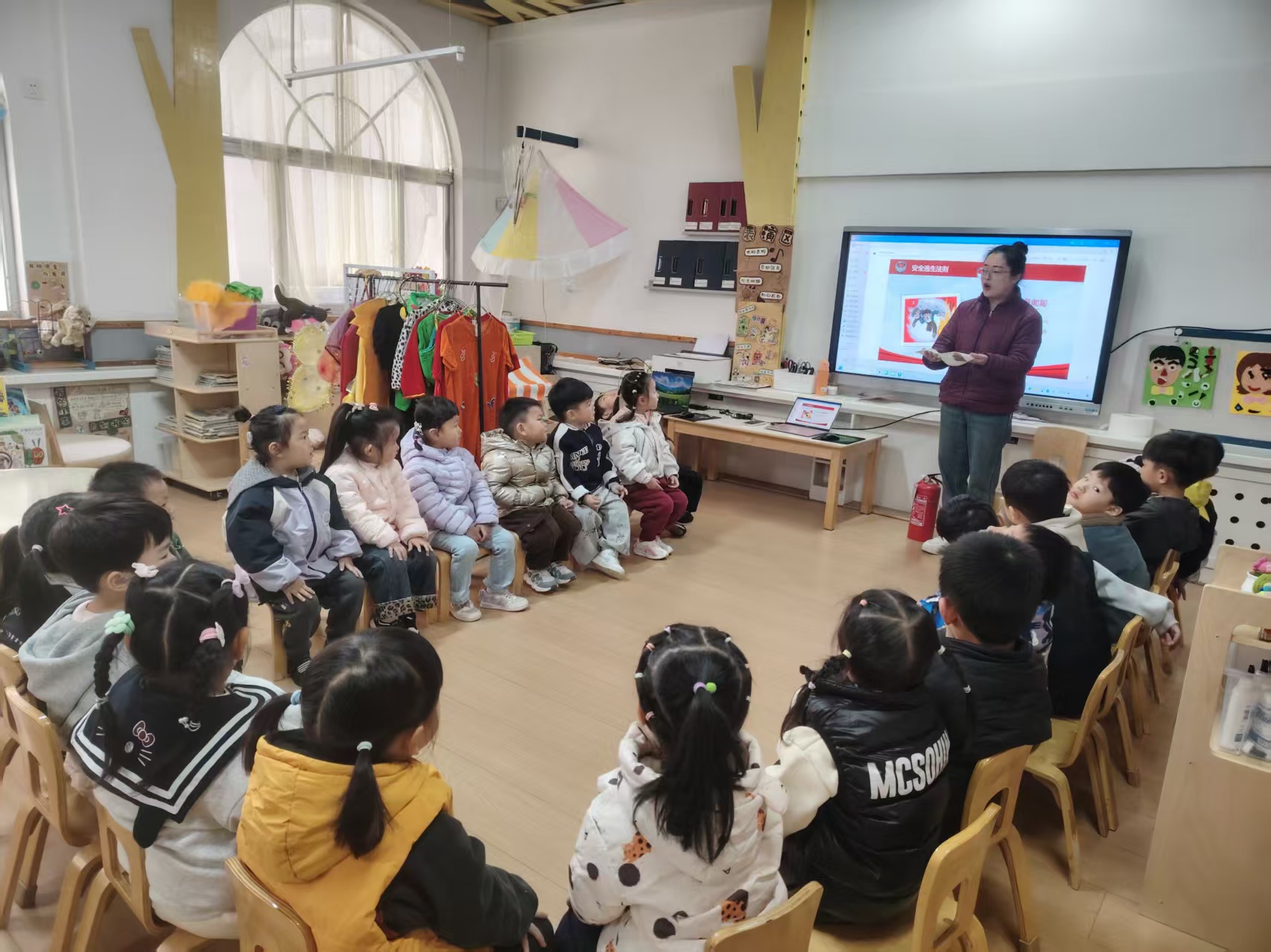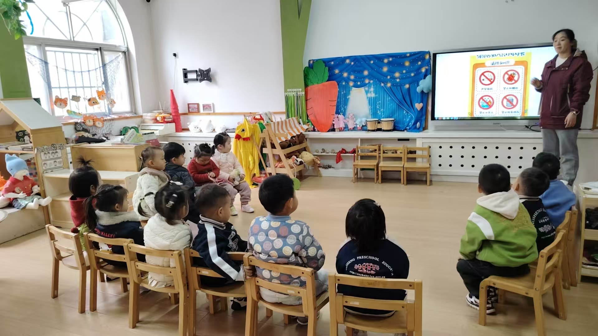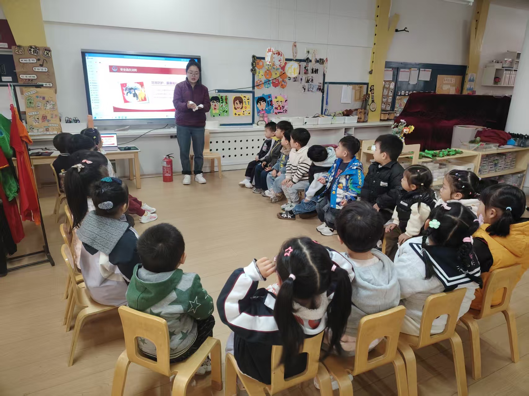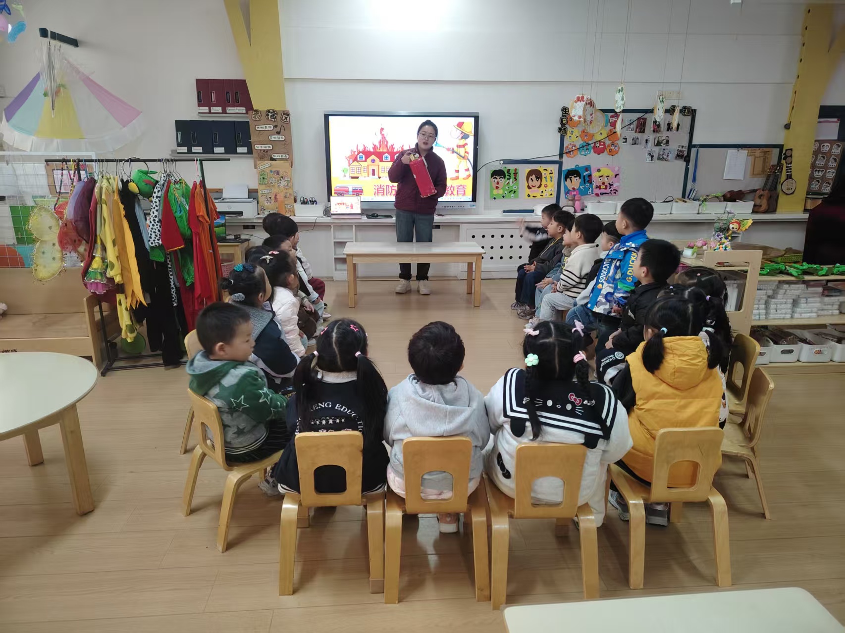 “小朋友们,火灾来临时要记住什么呀?”课堂上,老师温柔又认真地为孩子们讲解消防安全的重要性,用生动的绘本故事告诉大家火灾的危害,教孩子们牢记“不玩火、遇火不慌张”的安全准则。将消防安全的重要性悄悄种进孩子们心里。