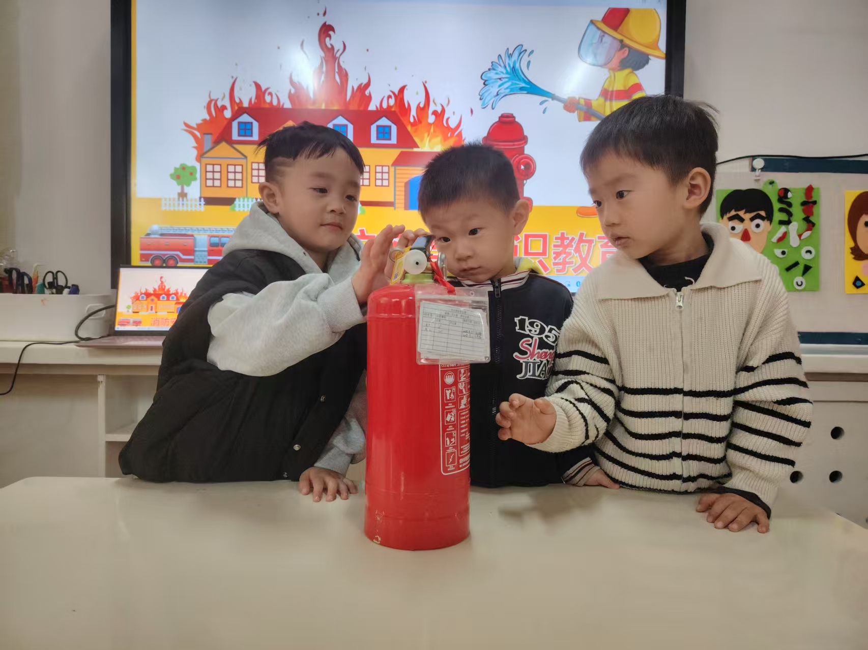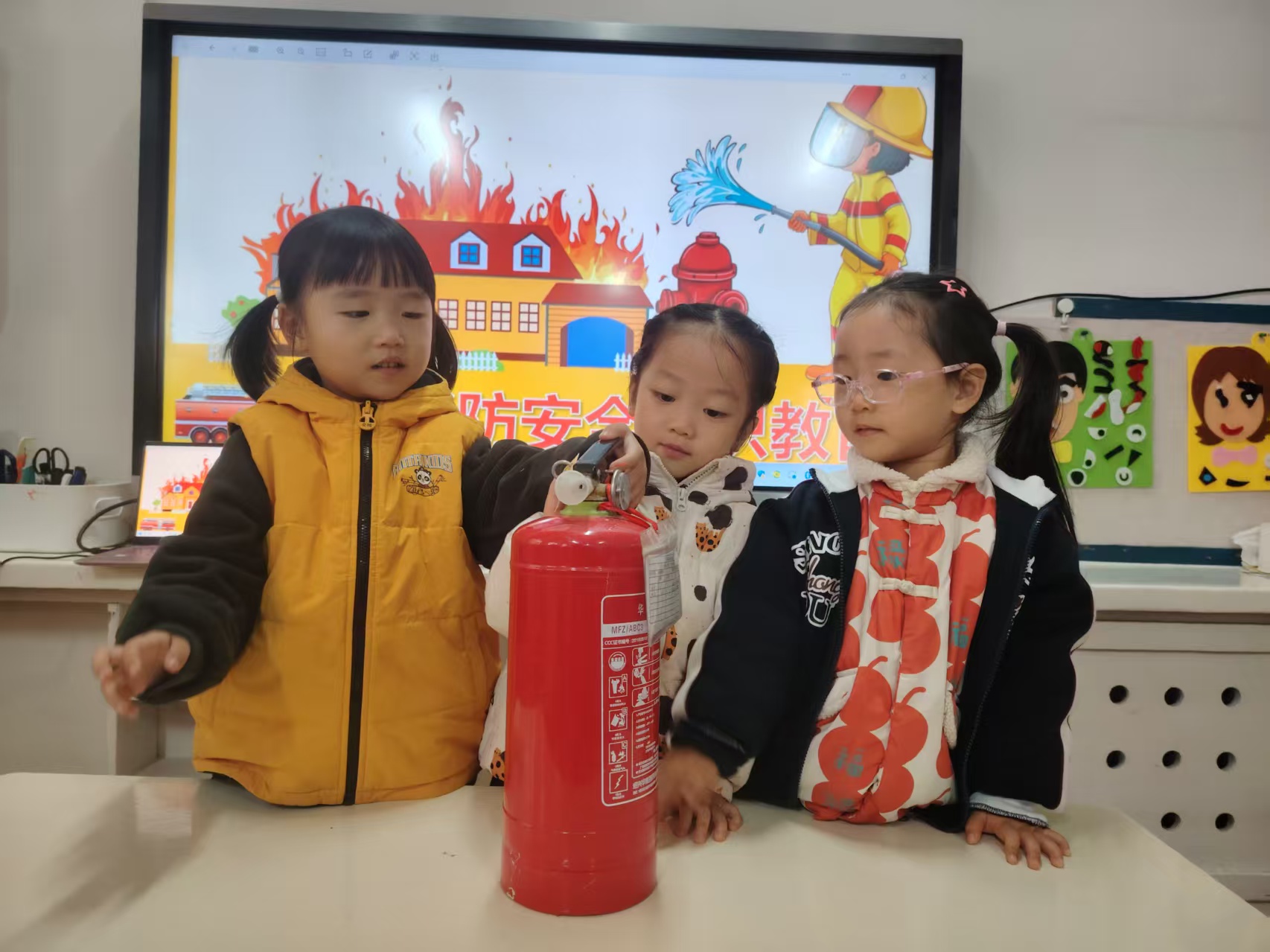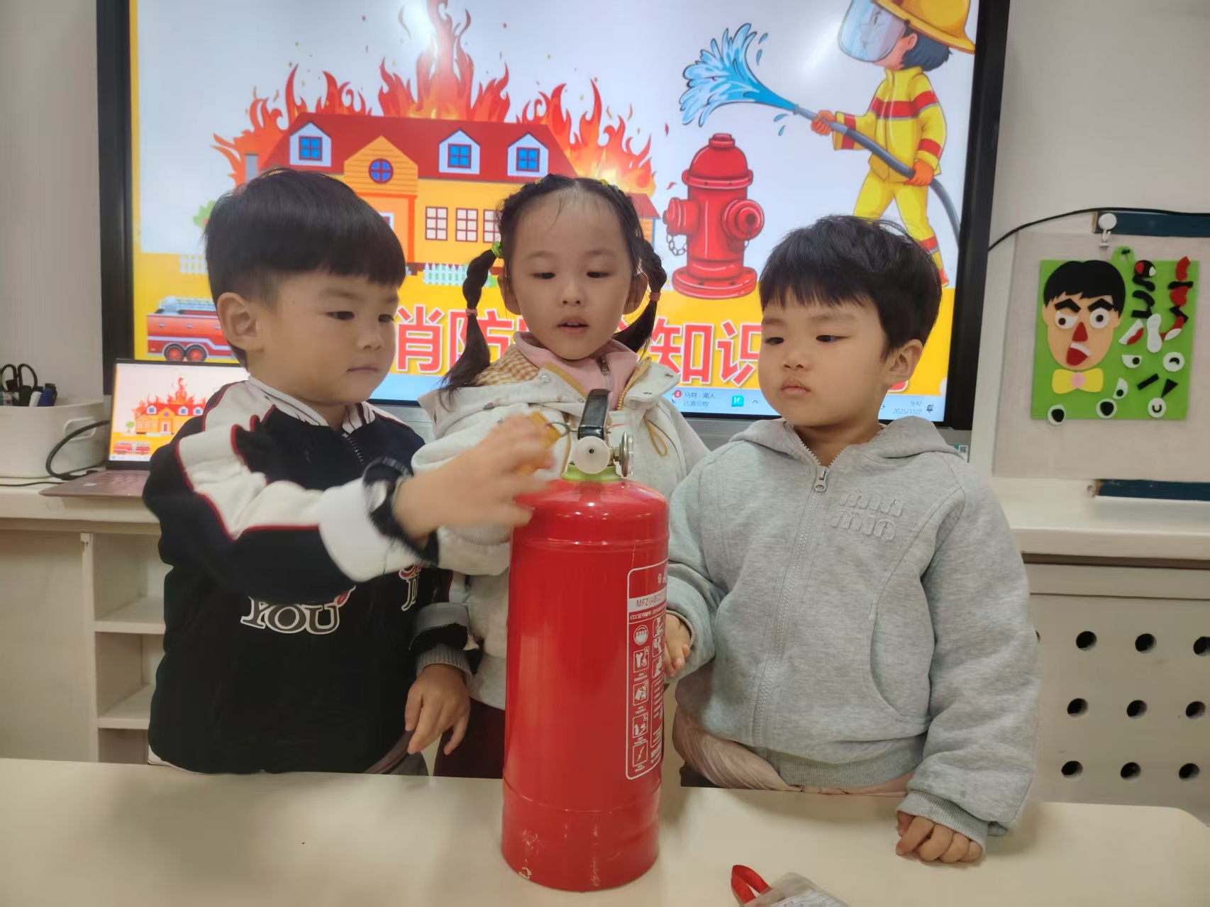 最让孩子们兴奋的是认识灭火器环节,老师现场展示灭火器,讲解它的用途和使用步骤,还让孩子们在安全前提下轻轻触摸,直观感受这个“防火小卫士”的神奇。