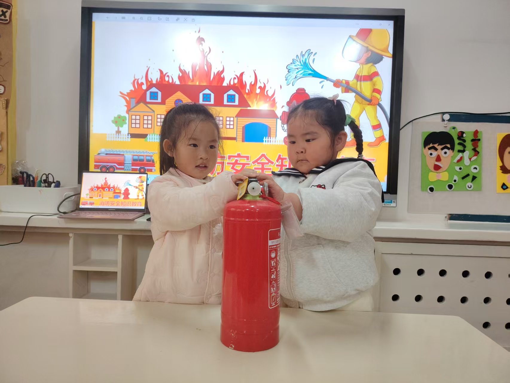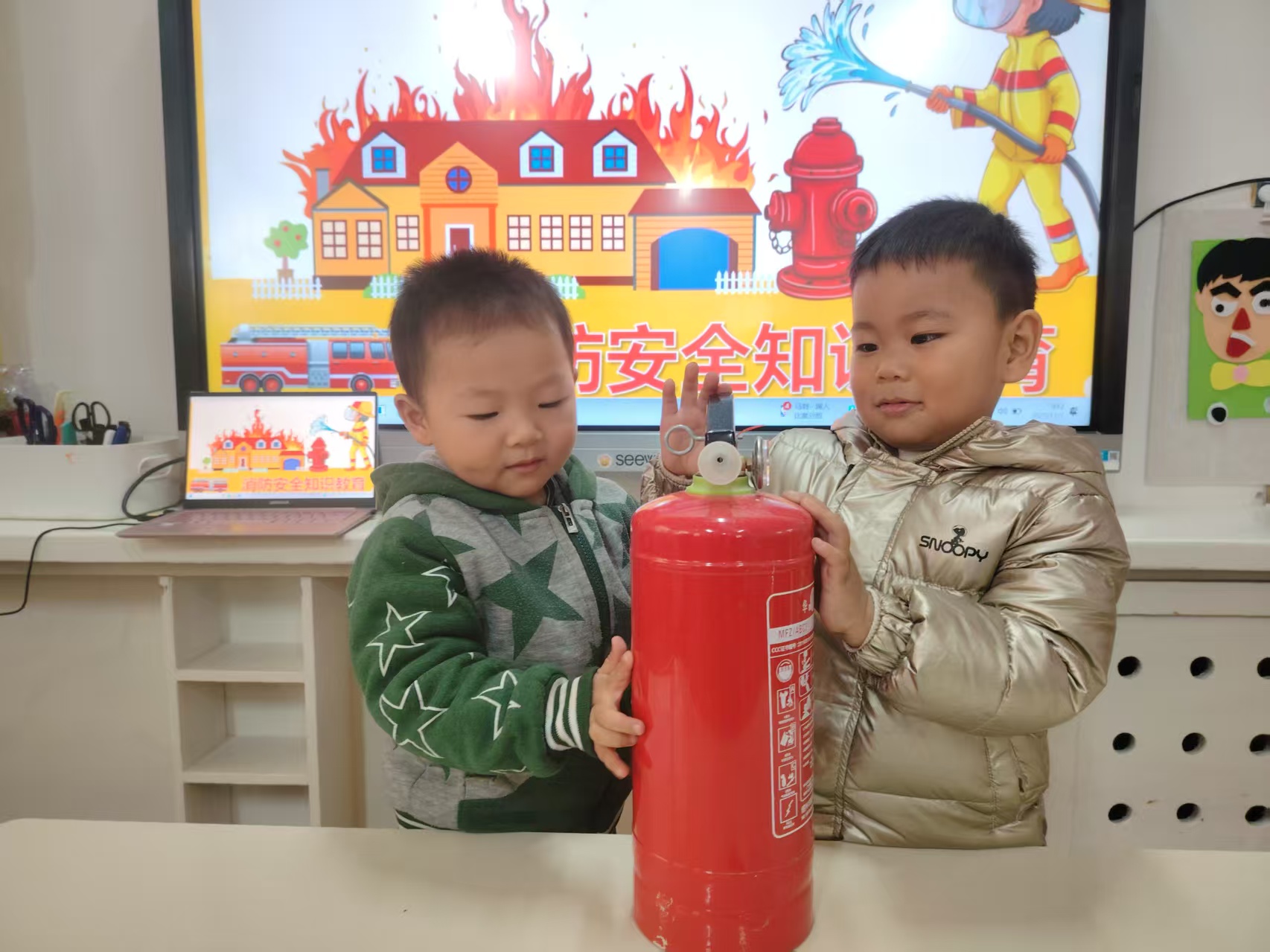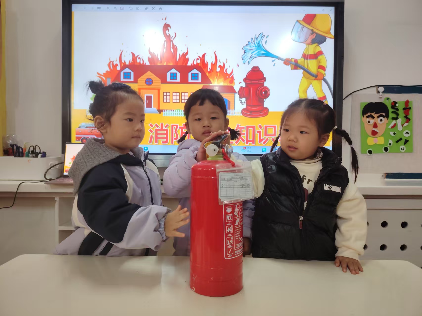 最让孩子们兴奋的是认识灭火器环节,老师现场展示灭火器,讲解它的用途和使用步骤,还让孩子们在安全前提下轻轻触摸,直观感受这个“防火小卫士”的神奇。