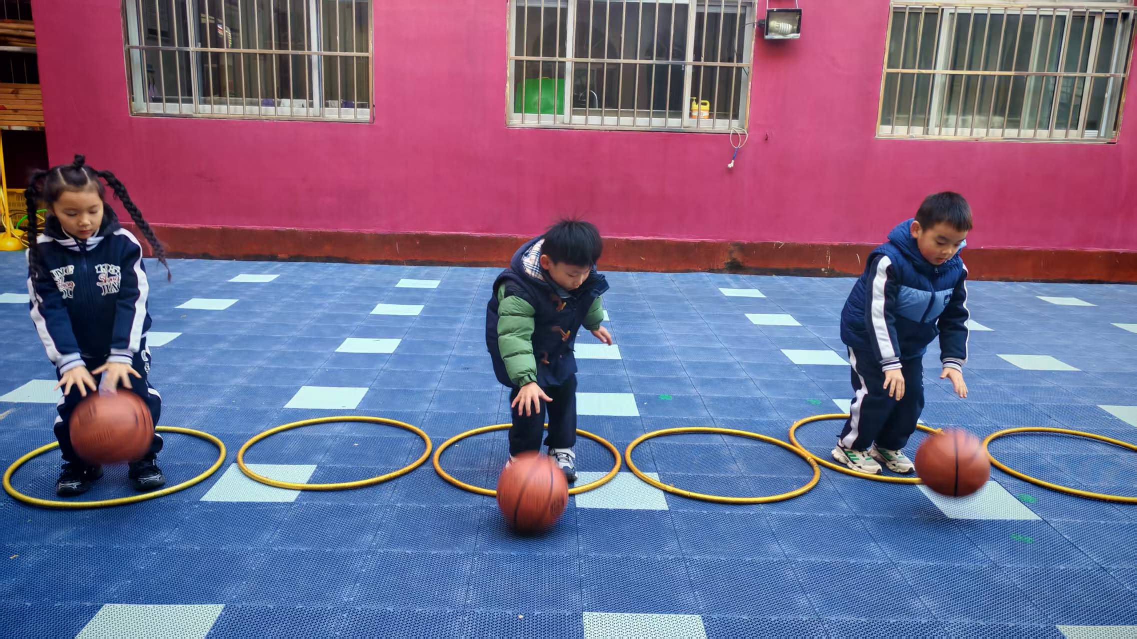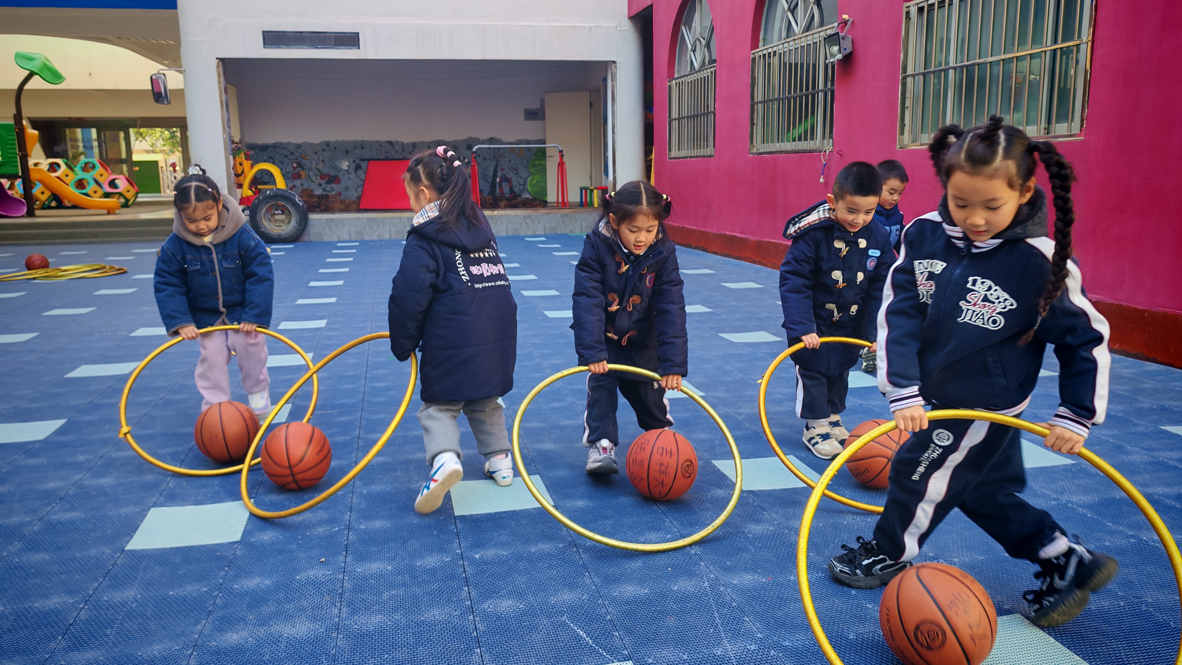 这一次,他们用圈圈运球,自己化身成搬运工,圈是工具,蓝球是物品,一人,一球,一圈,构成一副精美而绚丽的画。在运送的过程中,孩子们学习到如何更好地控制自己的身体,提高自身的平衡能力。虽然可能会遇到一些困难,但只要坚持下去,就一定能够成功!