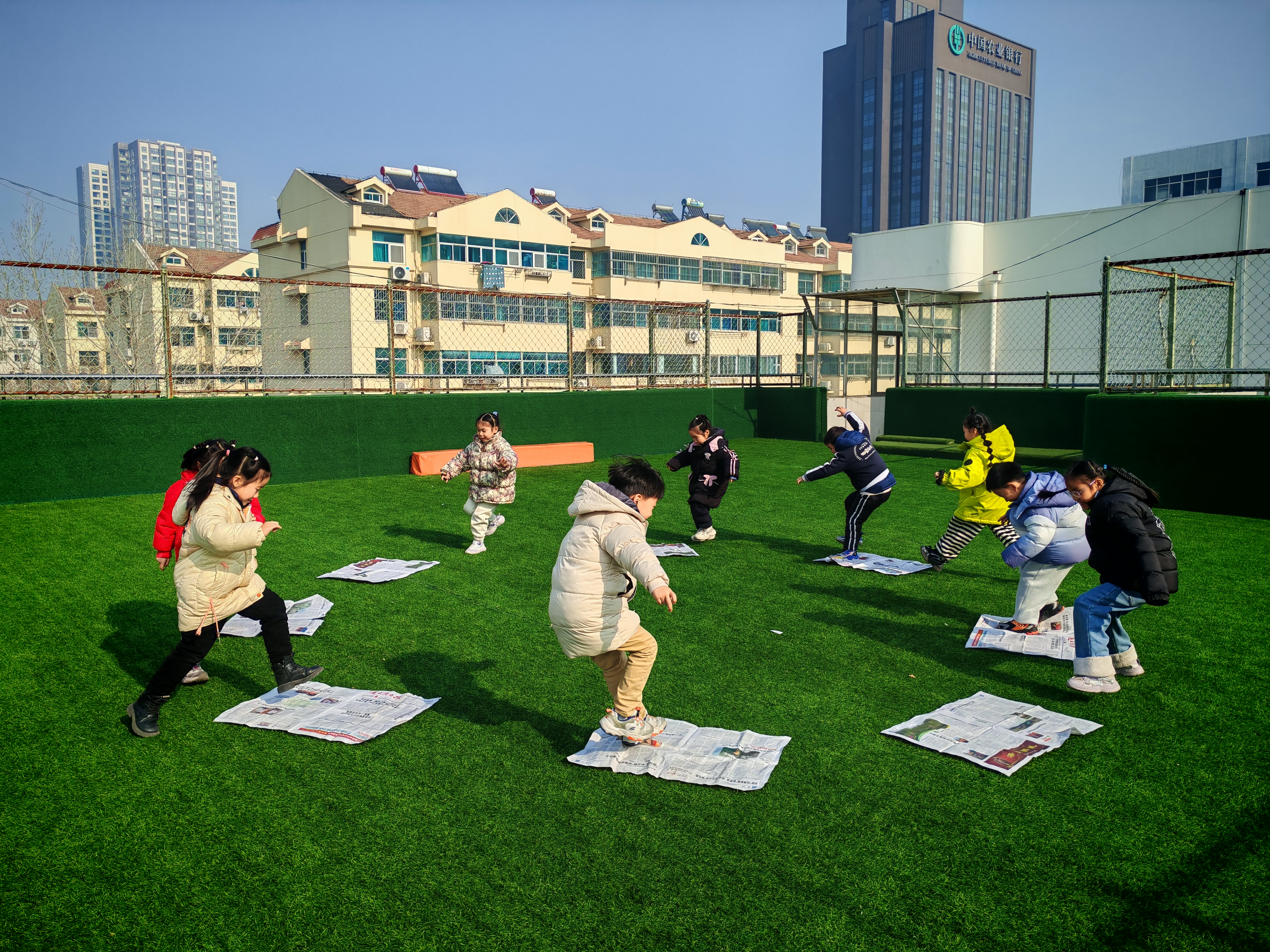 报纸搭桥过河也欢乐多多!萌娃们两两搭档,巧用报纸当“小桥”,一人用报纸搭建,一人小心迈步,两人默契配合,一步步踩着报纸向终点前进。在欢乐的游戏中萌娃们锻炼了自身的平衡能力,脚下的报纸连起伙伴间的信任,提高了合作能力。操场上的欢声笑语也藏着萌娃们的勇气与默契!