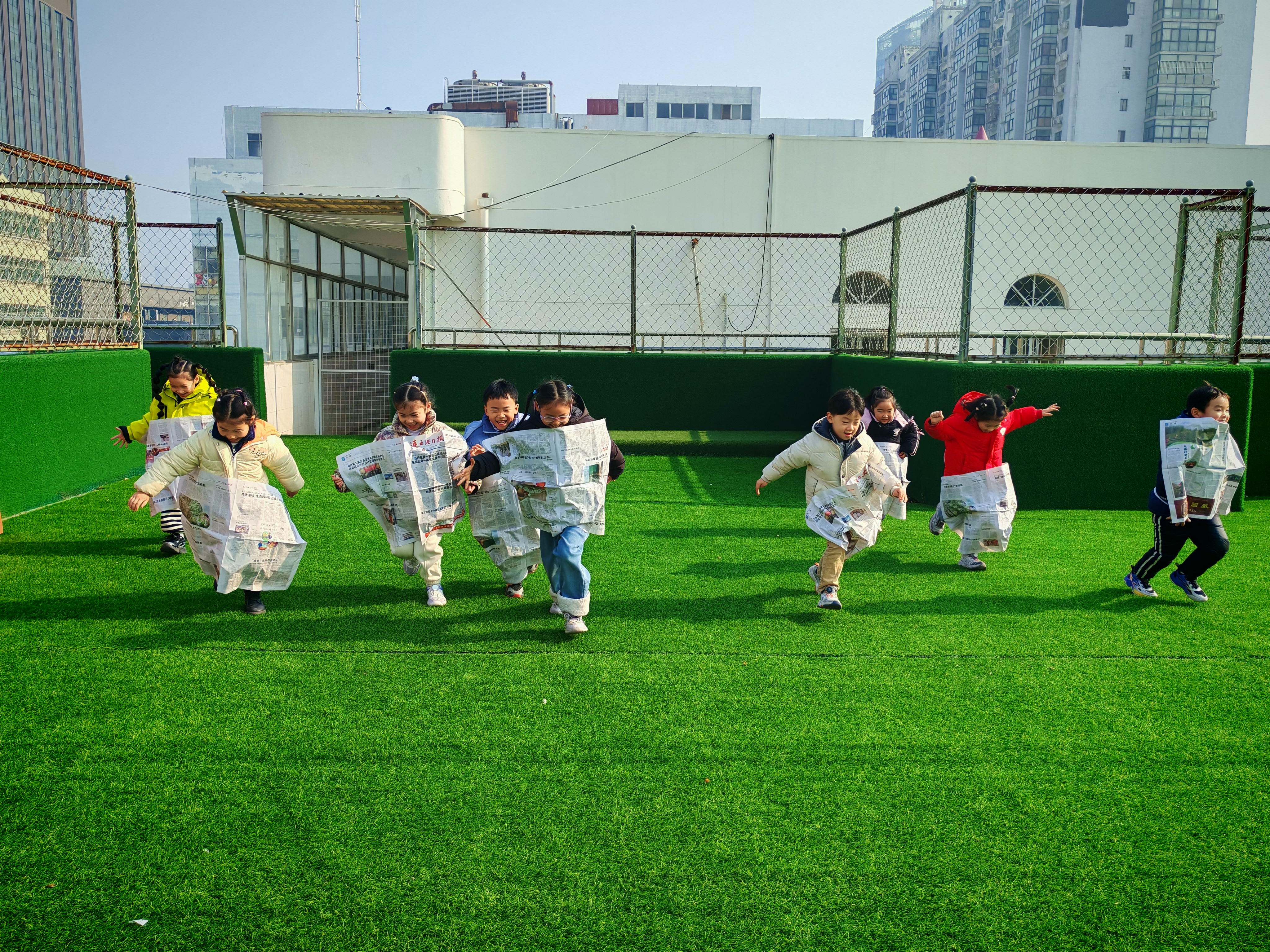 趣味报纸迎风跑活动拉开游戏的序幕。只见萌娃们双手稳稳报纸,一声令下在迎着微风向前的瞬间快速松手,大家屏气凝神、脚步轻快,小心翼翼护着报纸不落地,迎着风的方向大步向前,一张张报纸在宝们身上迎风展,一个个小身影在阳光下尽情跑。宝贝们在游戏中感受风的趣味,锻炼手眼协调与身体平衡,在尽情奔跑中释放童真活力,欢声笑语洒满操场,每一次向前都是童年最鲜活的美好模样。