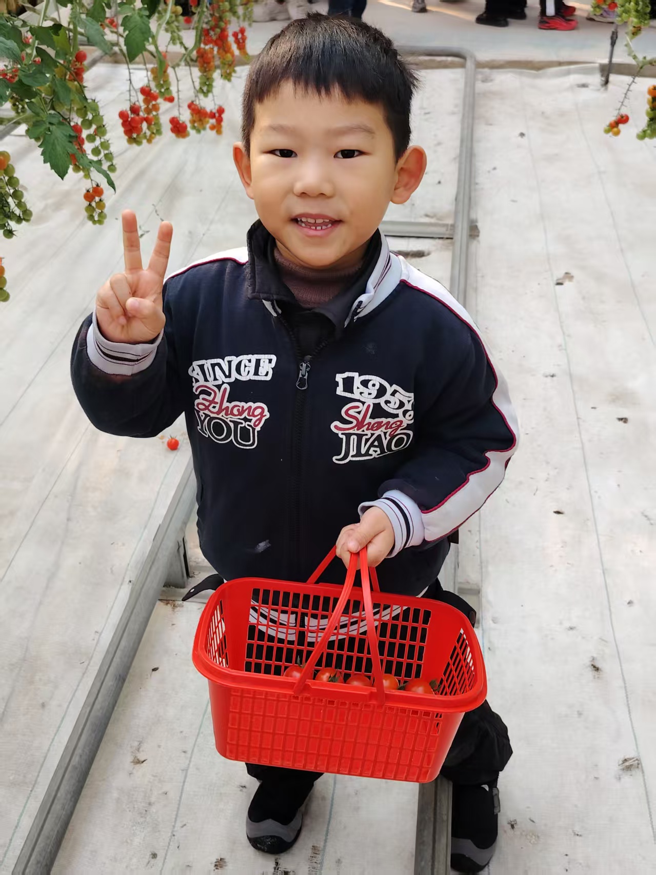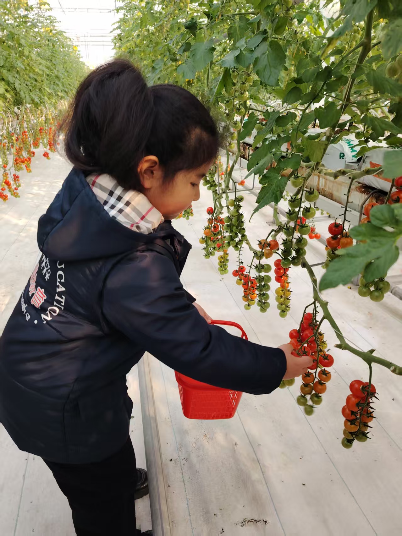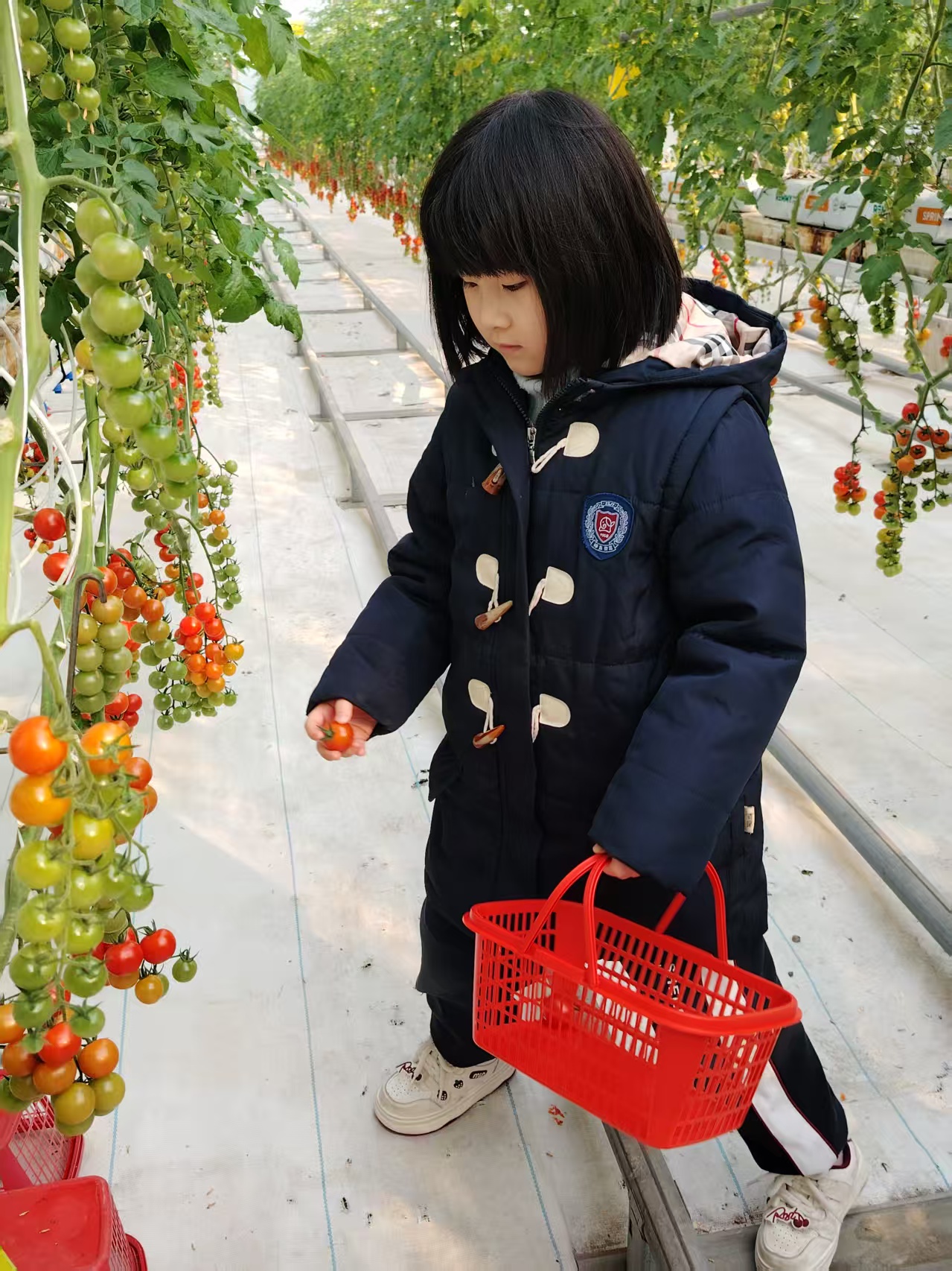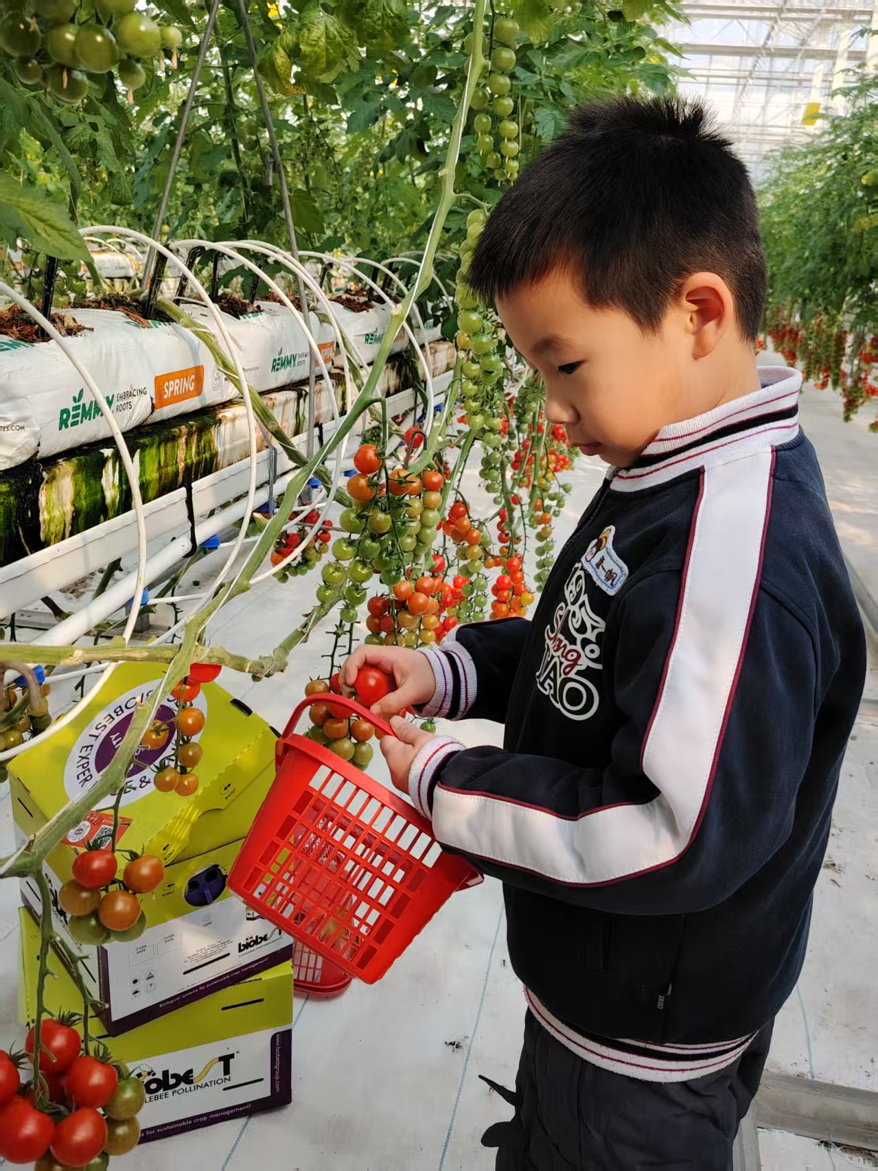 告别勇敢者之夜的温馨,宝贝们又踏上了充满生机的摘番茄之旅。走进绿意盎然的番茄大棚,一股清甜的果香扑面而来,挂满枝头的番茄像一个个小灯笼,红的、黄的,饱满又诱人,瞬间点燃了宝贝们的探索热情。
